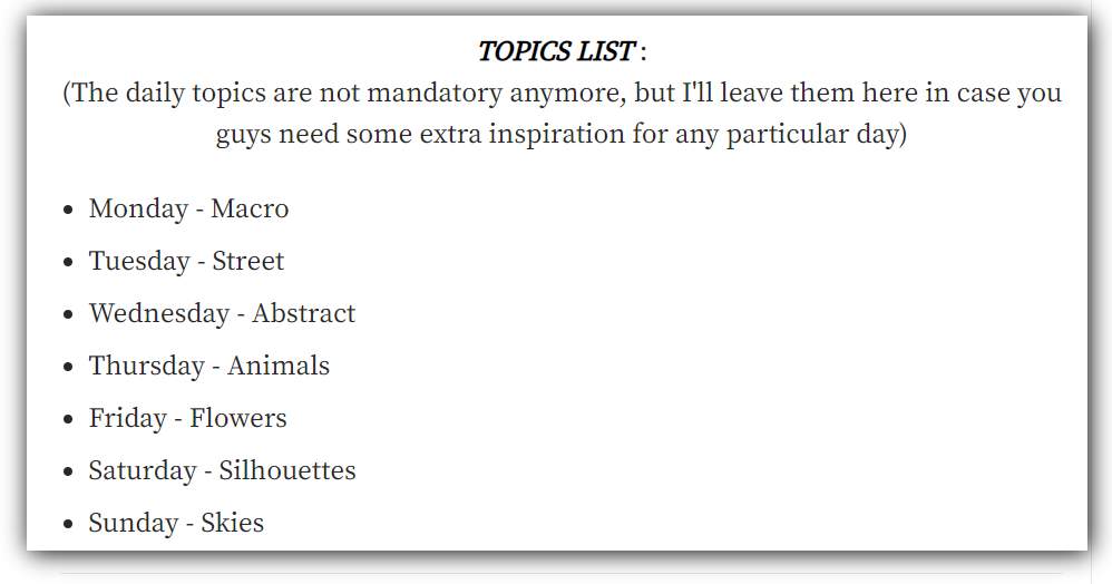 a. 基本上还是和上一季是一样的模式。你的帖可以是文章,视频,声频,诗歌,画画,摄影等等。最重要的元素是一定要能够让“我”微笑。这里的“我”代表着每一个到访你的帖的人,也包括你自己哟!