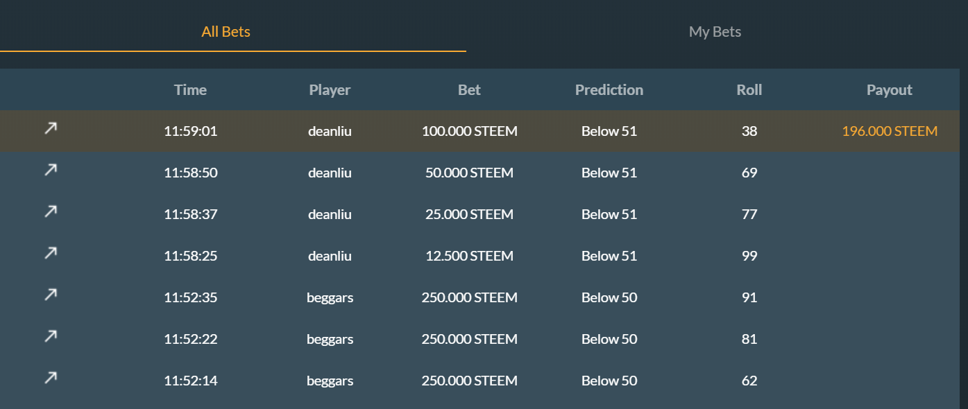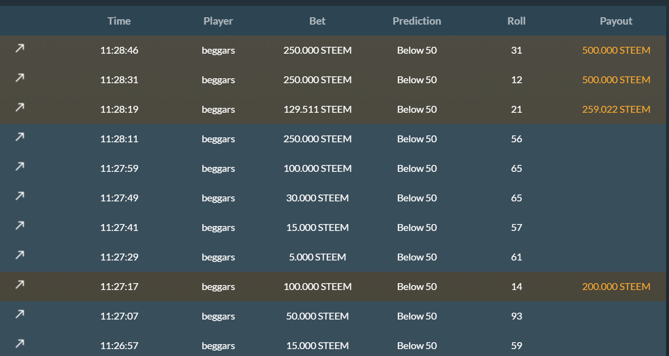 下午我就沒看了。剛剛去看,乞丐先生賭到快2萬,但我去看他錢包,已經阮囊羞澀了... 但說不定他一開始就是這麼多錢,一直進去滾而已。但莊家已經有利潤,我們可以分一點紅了,那乞丐先生應該是有賠錢了啦~~~~ 只是可能也沒有很多,考慮他可以拿到將近100萬顆EPC,也價值100 STEEMs啊~~~