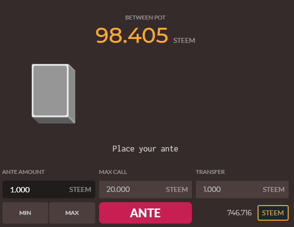 * **遊戲重點,第三張牌大小必須在前兩張牌之間,那就「插空隙」贏啦!** * **簡單流程**:每次遊戲都得先下「底注」(ANTE),這個錢是不退還的,目前是設定最低1 STEEM。下完才能抽兩張牌;看兩張牌後,你可以決定要不要繼續,要繼續就是下CALL,額度在1-10倍的底注之間。例如,你底注是2 STEEM,你CALL可以是2-20 STEEM。或是蓋牌,放棄這一輪,看下一副運氣是不是好點... 如果繼續,就是抽第三張牌,命運降臨! * **細部提示**:下CALL時還得給等量的CLASH,要是第三張牌撞上前兩張,那就等於損失兩倍CALL (CALL+CLASH);前兩張牌一樣,你直接可以拿走兩倍底注;「插空隙」成功,則你可拿回兩倍CALL(也就是賺一個CALL的金額),不成功,那就掰掰啦~~~ * **為何是練膽?**因為,可以下到20倍大的賭注,有機會翻本回來,但風險也很高,玩了你就知道~~~~