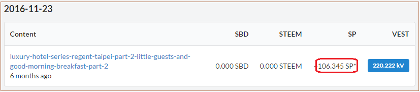 Okay, you are still reading! Great. Let me show you why. This morning when I was taking a little time out to re-live my old Steemit times (going though old posts and comments…), I saw this one with 100% SP - the #2 of my [Luxury Hotel Series] (which I haven’t dished out even the second hotel yet.. lol). Out of curiosity, I decided to check how much it had earned for me. No, not the payout number shown below as - first, it is the total payout, not the author’s cut and secondly, I wanted to know how much SPs (Steems in shareholder form) it had generated at that time.
