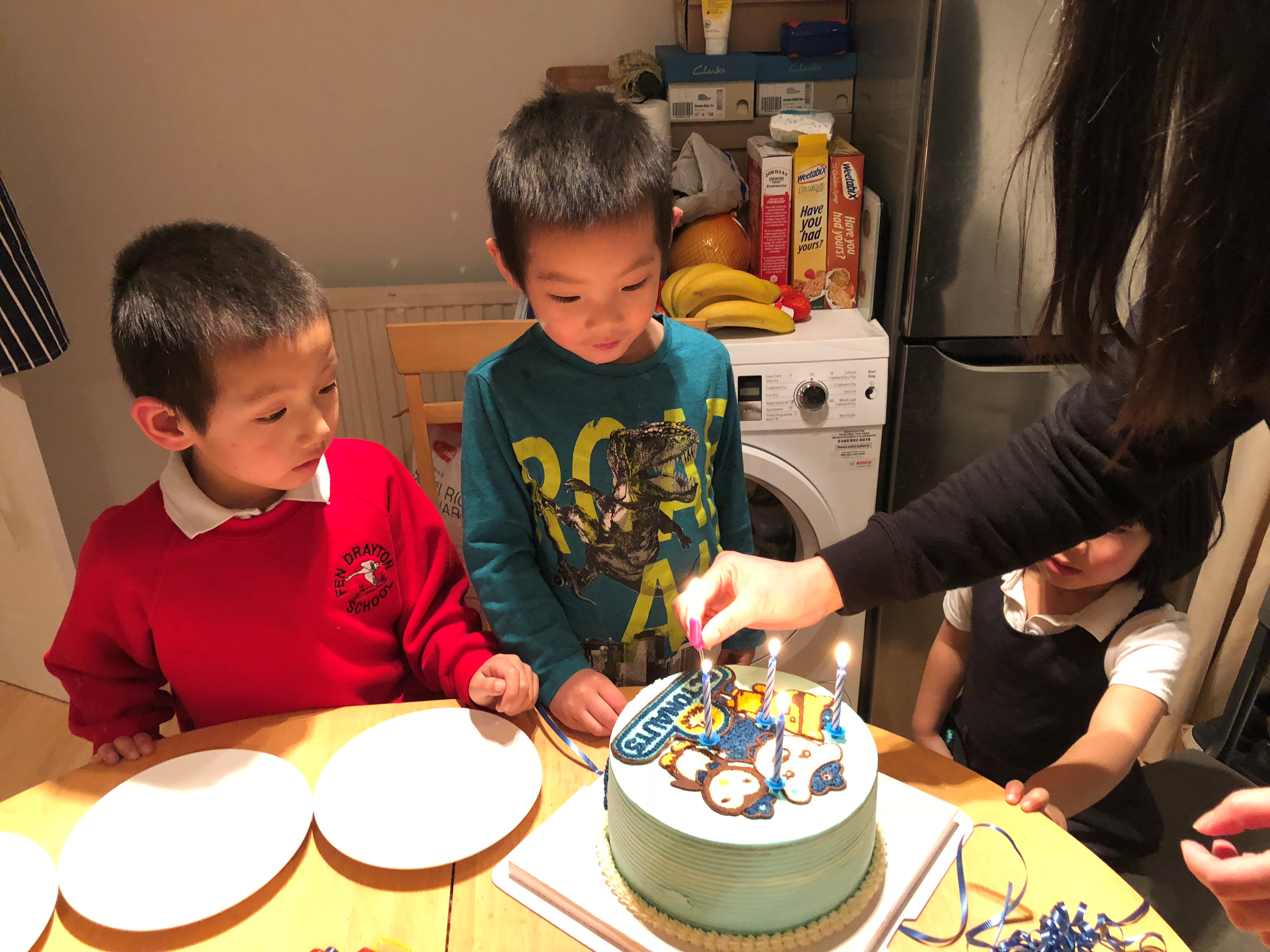 和孩子们一起唱生日歌。吹蜡烛都把口水吹到蛋糕上啦!