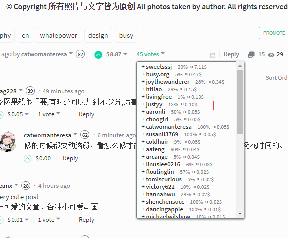 @justyy 是 https://justyy.com 的博主,在大哥 @tumutanzi 的介绍下加入 STEEMIT,写些帖子挣些小钱养家糊口。@justyy 也是CN 区的点赞机器人,对优质内容进行点赞,只要代理给 @justyy 每天收利息(年化率 10%)并且能获得一次相应至少2倍的点赞,可以认为是VP 200%+。加入计划最低代理10SP。CN 区的大鱼 @htliao 也加入了计划(代理了 530 SP)。